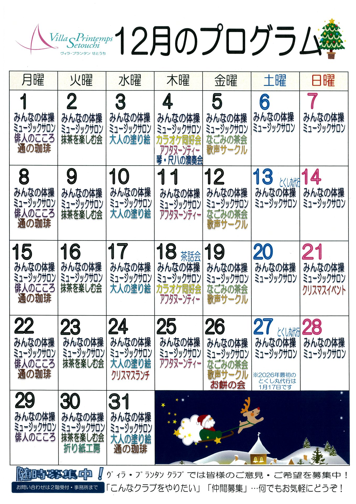 Topicsトピックス 2025.11.28 (fri) メニュー表(12/1~12/7) 12月1日~12月7日のメニュー表です。 2025.11.28 (fri) 12月のプログラム 12月のプログラムができました。 ゲスト様に喜んで頂けるよう企画しています。 2025.11.22 (sat) メニュー表(11/24~11/30) 11月24日~11月30日のメニュー表です。 2025.11.15 (sat) メニュー表(11/17~11/23) 11月17日~23日のメニュー表です。 2025.11.08 (sat) メニュー表(11/10~11/16) 11月10日~11月16日のメニュー表です。 2025.11.01 (sat) メニュー表(11/3~11/9) 11月3日~11月9日のメニュー表です。 2025.10.30 (thu) 11月のプログラム 11月のプログラムができました。 ゲスト様に喜んでいただけるよう企画しています。 2025.10.30 (thu) ご家族を困惑させた認知症の問題行動 坂本恵子様(仮名) 2017年入居 79歳 入居時 要介護 2 坂本様は2012年にご主人を癌で亡くされ、その後はデイサービスを利用しながら独居生活を続け [ … ] 2025.10.29 (wed) 「親を介護する自信」について 私たちは介護のプロです。 介護に関する技術や知識、制度なども知っています。 そのうえでお伝えしたいことがあります。 技術や知識があっても、家族だからこそ、時には [ … ] 2025.10.25 (sat) メニュー表(10/27~11/2) 10月27日~11月2日のメニュー表です。 ‹ 12 3 ...› » 最近の投稿 メニュー表(12/1~12/7) 12月のプログラム メニュー表(11/24~11/30) メニュー表(11/17~11/23) メニュー表(11/10~11/16) アーカイブ 2025年11月 2025年10月 2025年9月 2025年8月 2025年7月 2025年6月 2025年5月 2025年4月 2025年3月 2025年2月 2025年1月 2024年12月 2024年11月 2024年10月 2024年9月 2024年8月 2024年7月 2024年6月 2024年5月 2024年4月 2024年3月 2024年2月 2024年1月 2023年12月 2023年11月 2023年10月 2023年9月 2023年8月 2023年7月 2023年6月 2023年5月 2023年4月 2023年3月 2023年2月 2023年1月 2022年12月 2022年11月 2022年9月 2022年8月 2022年7月 2022年6月 2022年5月 2022年4月 2022年3月 2022年2月 2022年1月 2021年12月 2021年11月 2021年10月 2021年9月 2021年8月 2021年7月 2021年6月 2021年5月 2021年4月 2021年3月 2021年2月 2021年1月 2020年12月 2020年11月 2020年10月 2020年9月 2020年8月 2020年7月 2020年6月 2020年5月 2020年4月 2020年3月 2020年2月 2020年1月 2019年12月 2019年11月 2019年10月 2019年9月 2019年8月 2019年7月 2019年6月 2019年5月 2019年4月 2019年3月 2019年2月 2019年1月 2018年12月 2018年11月 2018年10月 2018年9月 2018年8月 2018年7月 2018年6月 2018年5月 2018年4月 2018年3月 2018年2月 2018年1月 2017年12月 2017年11月 2017年10月 2017年9月 2017年8月 2017年7月 2017年6月 2017年5月 2017年4月 カテゴリー イベント お客様の声 お知らせ ご案内 メニュー表 施設を考える 未分類