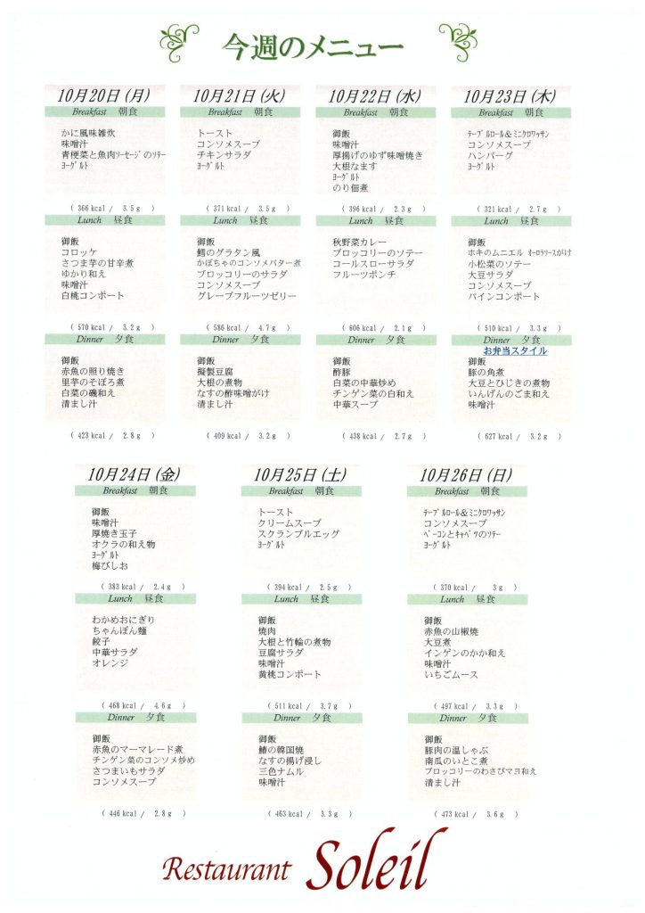 10月20日~10月26日のメニュー表です。