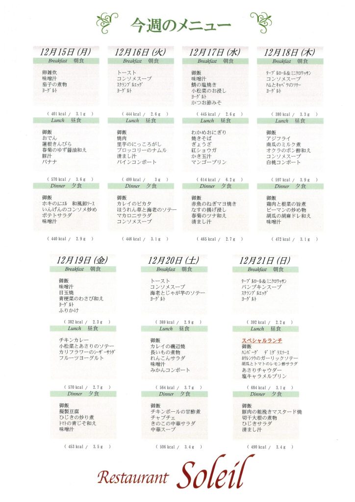 12月15日~12月21日のメニュー表です。