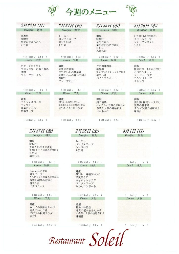 2月23日~2月28日のメニュー表です。